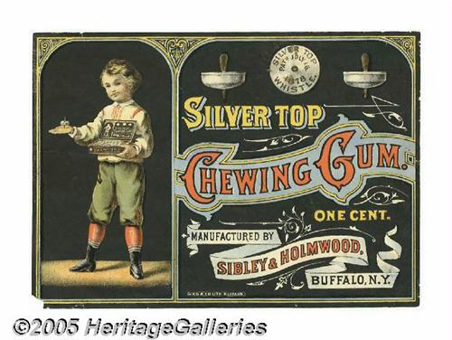 <B>Silver Top Chewing Gum Crate Label Circa 1890</B></I> From the Sibley & Holmwood Confectioners Company of Buffalo, New York, here is a rare old color lithographed label made to go on the back of their wooden shipping boxes. It is approximately 9" x 6.5" in size and pictures a young lad in period clothing holding a silver top in one hand and a box of Silver Top chewing gum in the other. Clean and bright with only a tiny (approximately .25") piece torn from the lower left corner. Lot:252