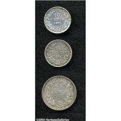 <B>Silver Trio,</B></I> KM116 10 Cents 1892 XF and 1896 XF; KM115 25 Cents 1897 XF. 3 coins <BR><BR><B>Important notice:</B> Heritage usually auctions material at the rate of 200-250 lots per hour. On some occasions eBay Live bid software or the Internet may not be able to keep up with the pace of the auction. We recommend placing a realistic absentee bid now as insurance to avoid disappointment. Occasionally the auctioneer may eliminate or reject an eBay Live bid, and the auctioneer may also reopen a lot after the close of the eBay live bidding (usually because we missed an audience bid), and may reject your bid even if it shows you as the winning bidder. By bidding via eBay Live, you agree that Heritage may award the lot to another bidder at its sole discretion under the circumstances described above or any other reasonable circumstances. Since eBay bids are not shown to us until we open the lot on the floor, we treat those bids just like floor bids. In most cases the floor responds before the eBay bid is presented to us, due to Internet lag time, so for consistency we have made it a policy that floor bids are always considered first over tie eBay live bids. Also please note that all Heritage lots purchased through eBay Live carry a 20% Buyer's Premium. Please make sure you read the Terms and Conditions before you bid.