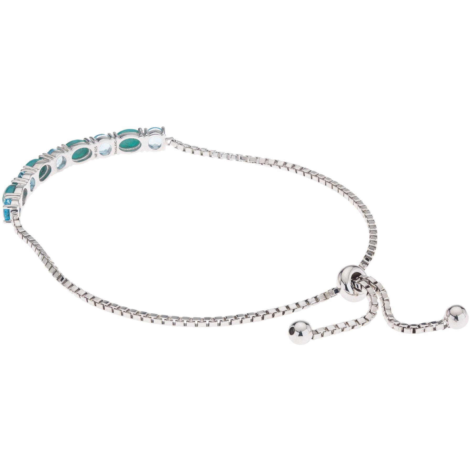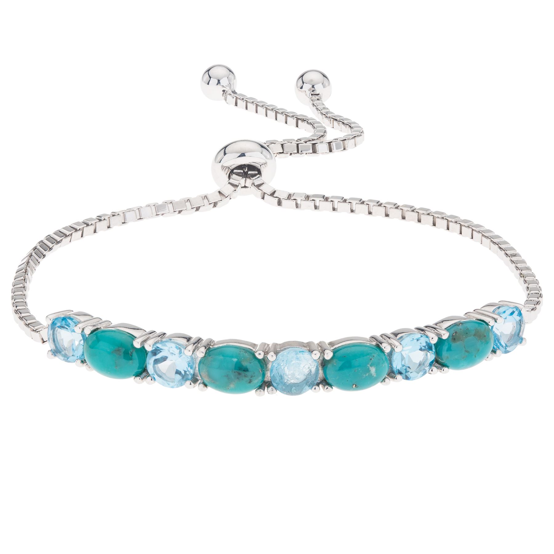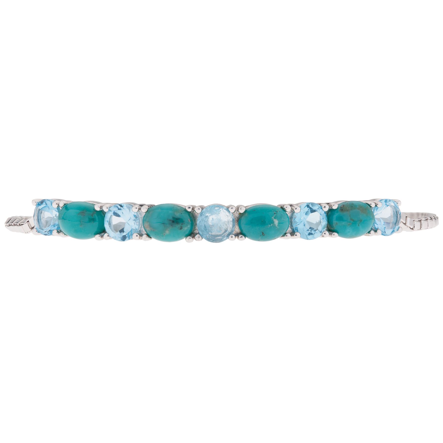 What a striking design! Beautifully styled by Pangea Mines skilled artisans, this handsome bracelet is lavishly adorned with genuine heavenly blue turquoise complemented by sparkling Swiss blue topaz. Crafted in gleaming rhodium over sterling silver, this smart design features an adjustable slide bead that provides perfect fit—and comfort. Add this sophisticated fashion accent to your collection today.
