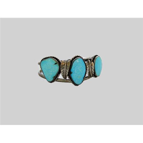 This lovely cuff bracelet is 2-1/2" in width when it begins to curve around the wrist. There are 3 perfect condition turquoise stones with a leaf design in between. The bracelet is not marked. This is not a new piece but rather about 50 years old.