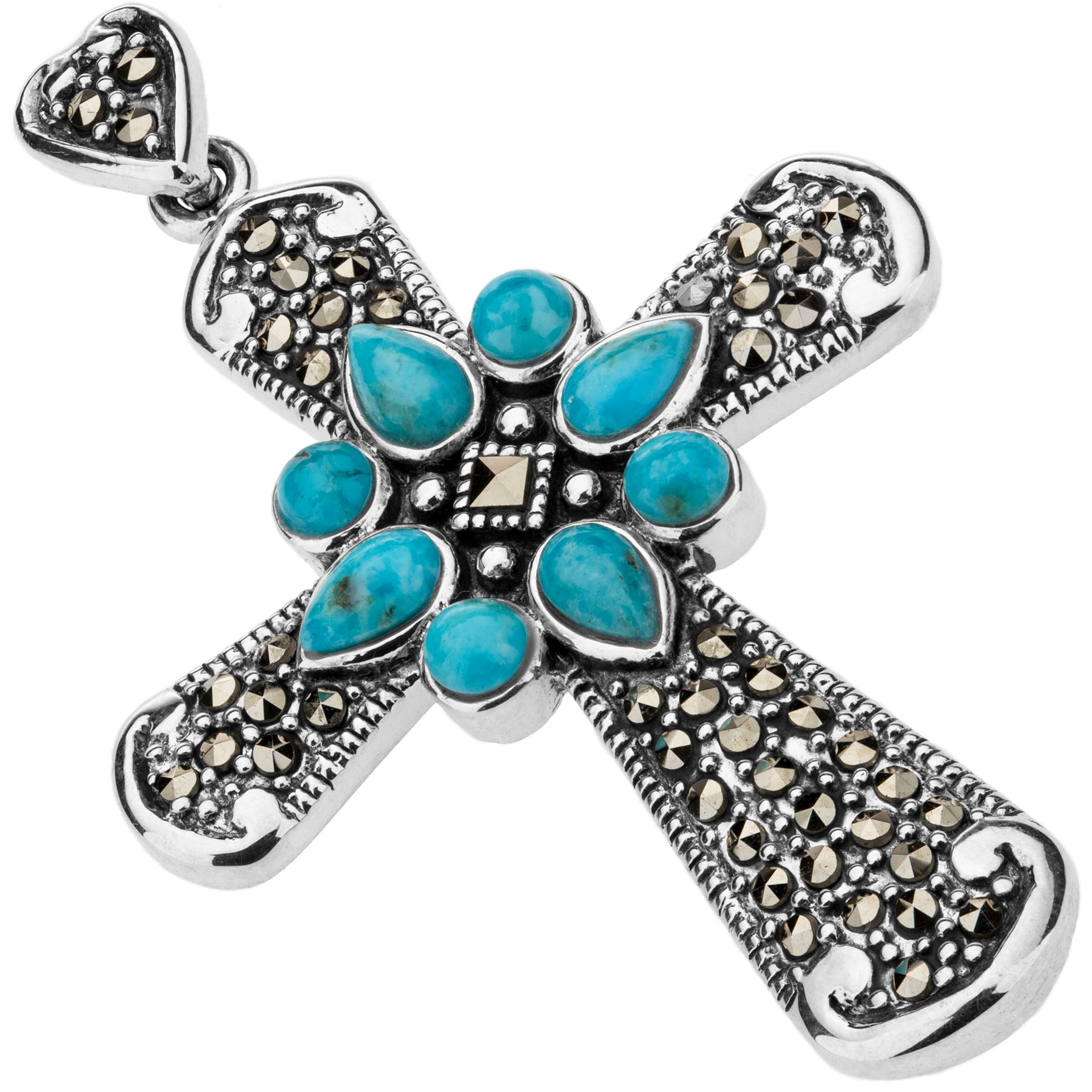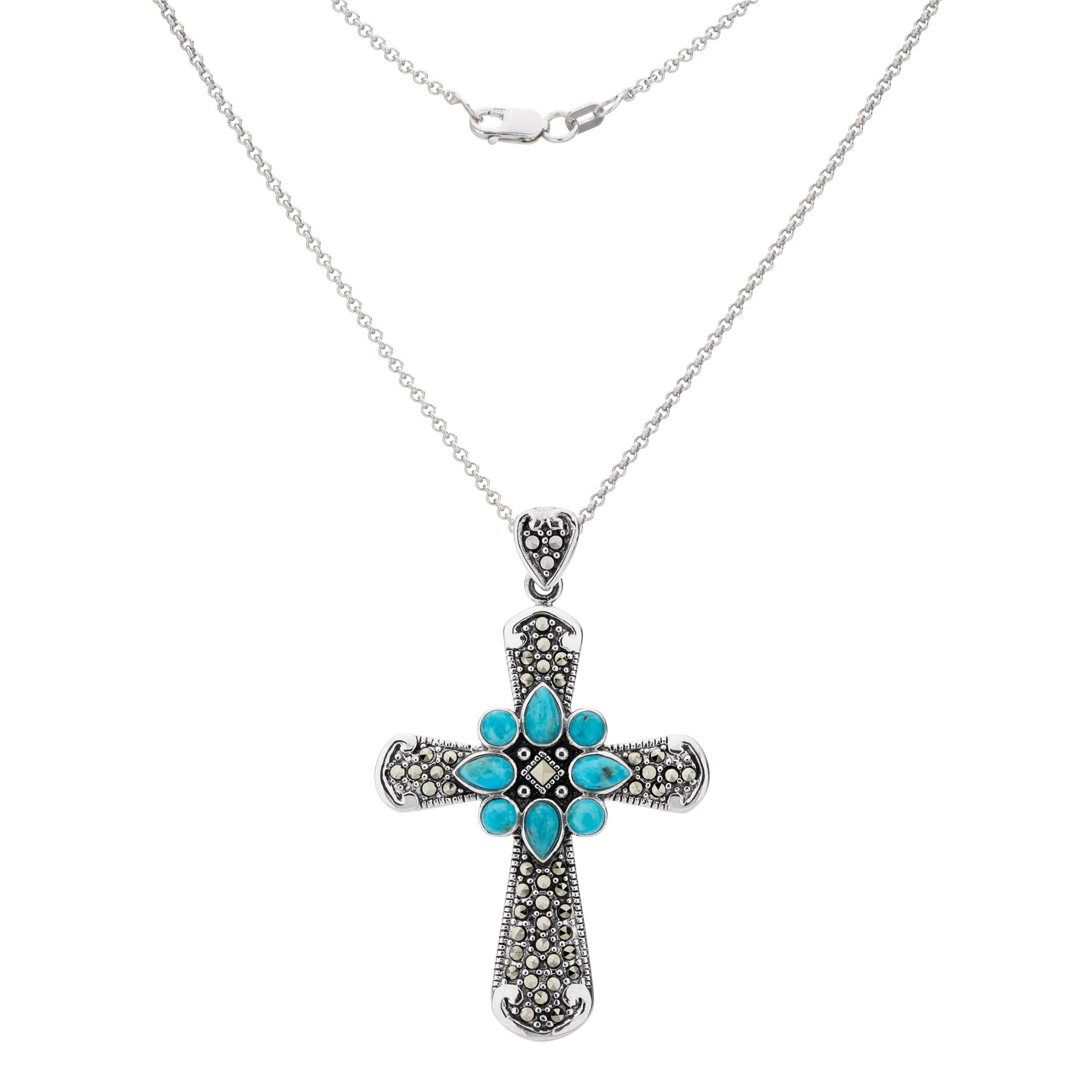Heavenly color and classic lines makes this lovely cross from the Addison Lane Felicity collection a smart addition to any collection. Beautifully crafted in oxidized sterling silver and adorned with pear and round cut genuine turquoise and sparkling marcasite accents, it includes a complementary 18” chain with lobster claw clasp for convenience and security.