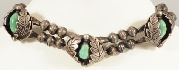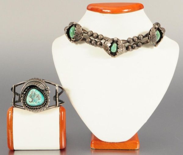 Unmarked. Necklace, 12"L; Bracelet 1-1/2" at widest point.