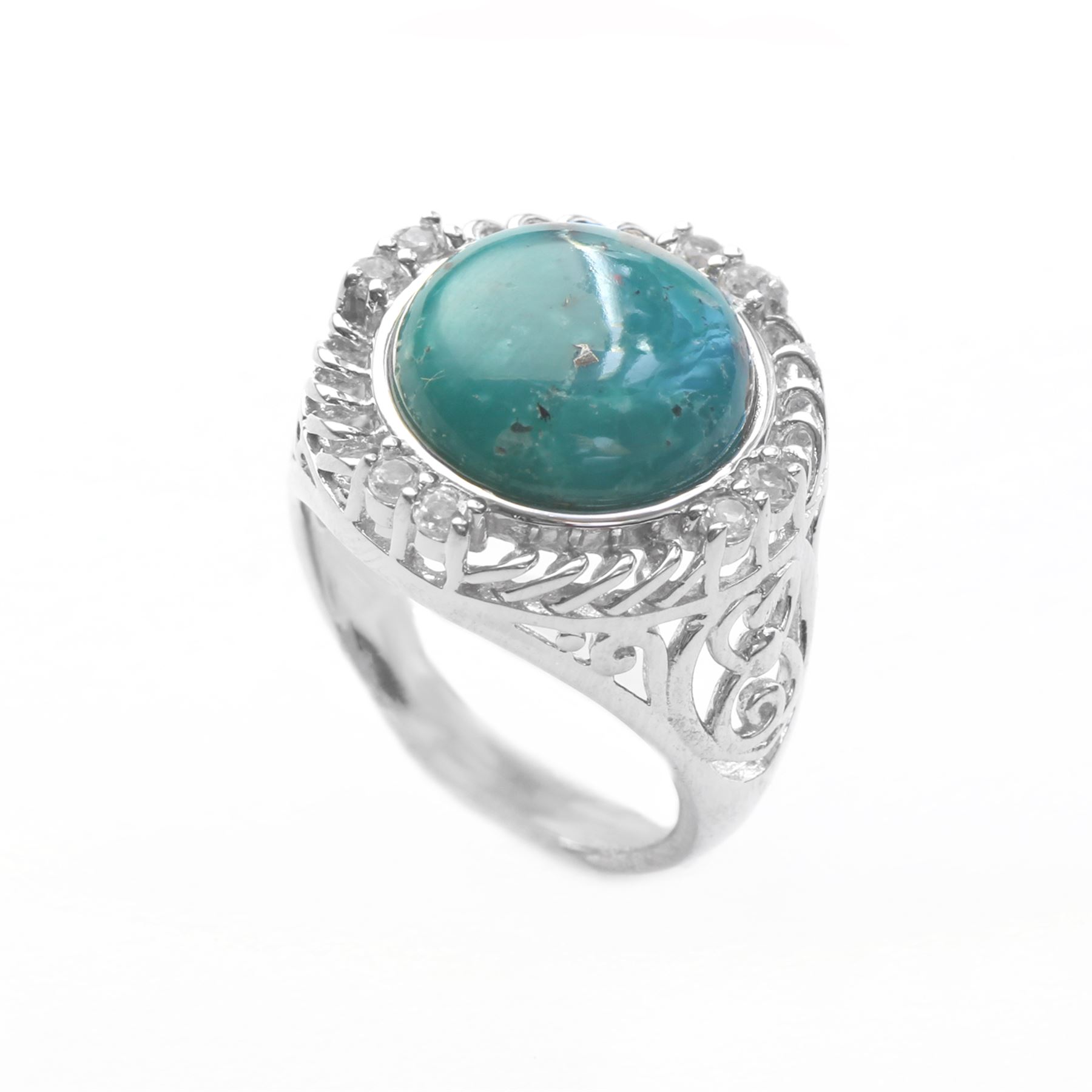 One round alluring genuine campo frio turquoise cabochon is artfully crowned wtih mesmerizing spirals of sterling silver. Pairs of shimmering white topaz mark the cardinal points and open scrollwork side galleries keep the fit light and lively. Complete with a High polished rhodium plate to prevent tarnishing.