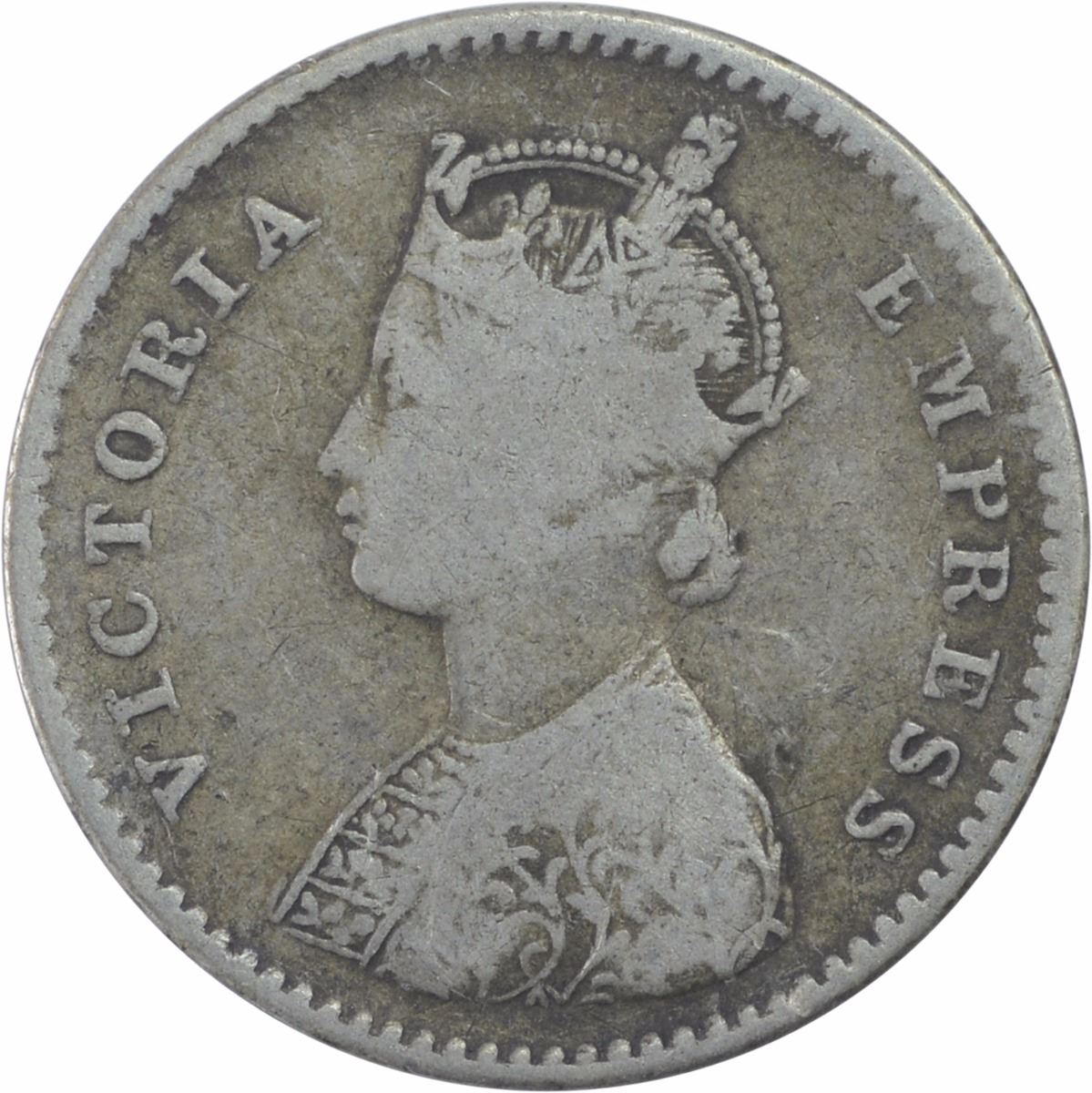 1884,Victoria Empress,Silver 2 Annas, Bombay Mint,A/I/None, (PR # 531),about very fine.