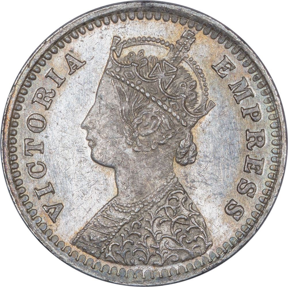 1891, Victoria Empress, Silver 2 Annas, Bombay Mint, C/II/B incuse, (PR # 546),tonedGem UNC, Rare in this lovely rainbow toning grade.