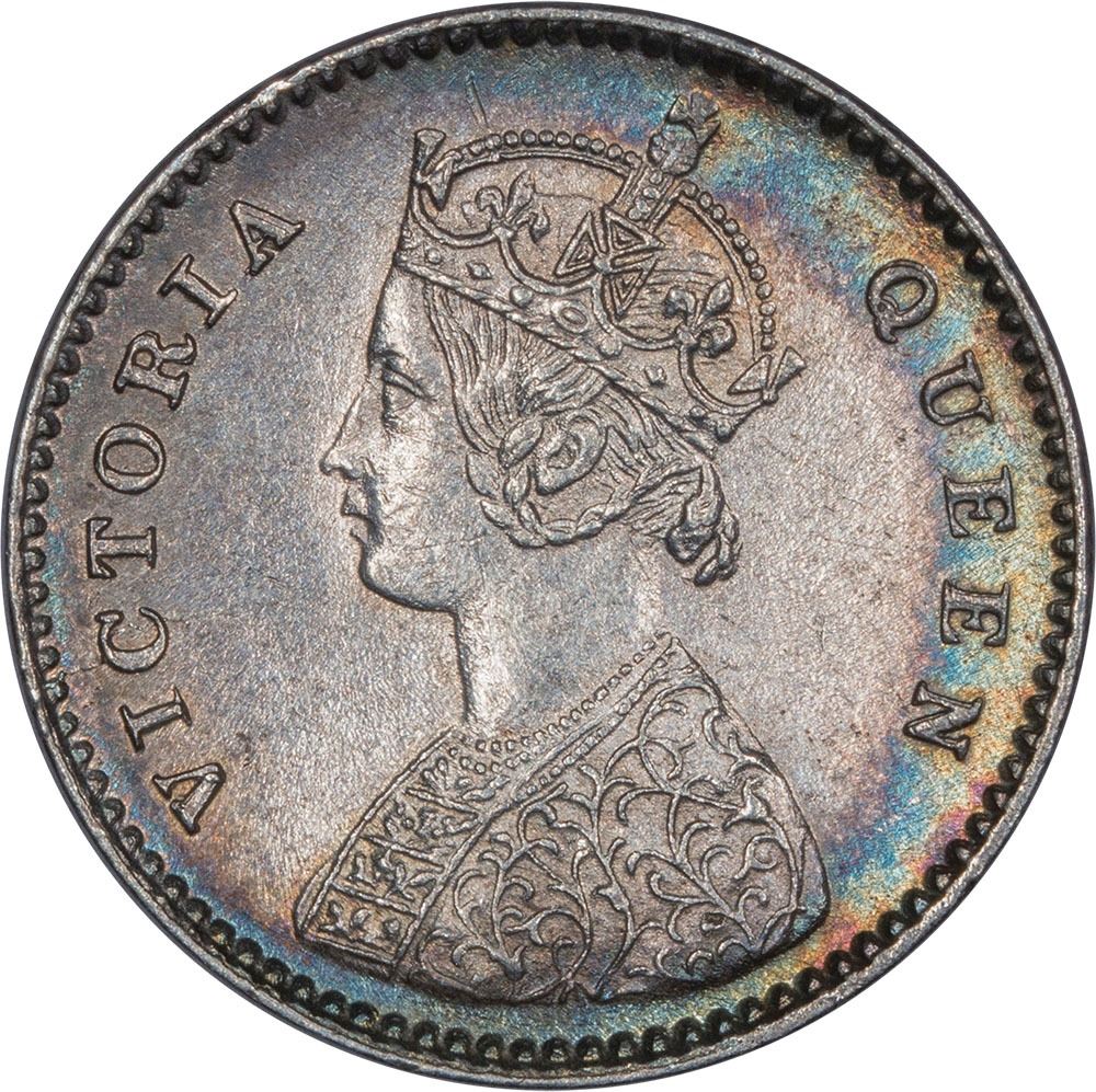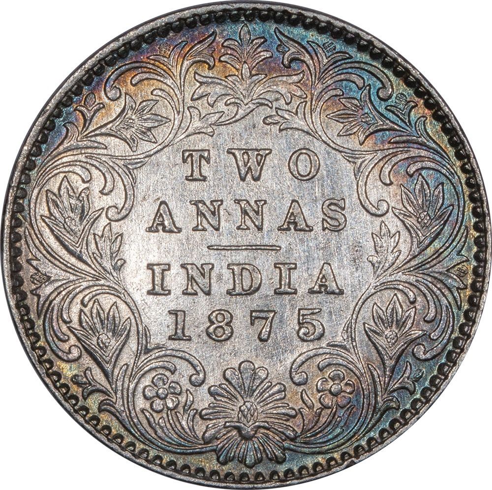 1875, Victoria Empress, Silver 2 Annas, Calcutta Mint, A/I, (PR # 489), multicolortoned UNC, Rare.This specimen has got lovely rainbow toning overall on either side making it eye pleasing.