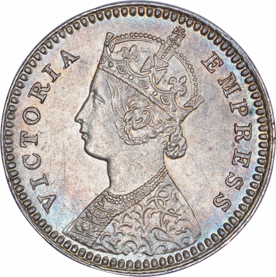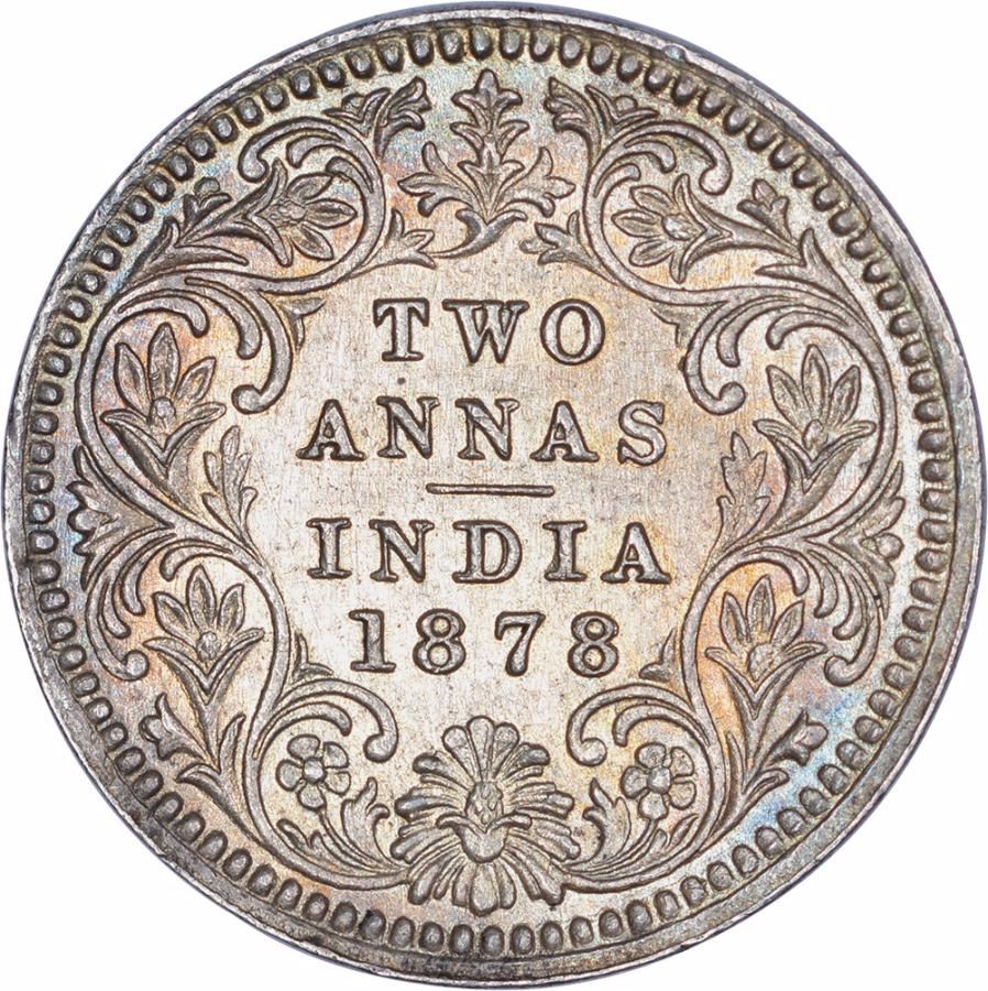 1878, Victoria Empress, Silver 2 Annas, Calcutta Mint, B/II/None, (PR # 493), toned UNC, Rare.