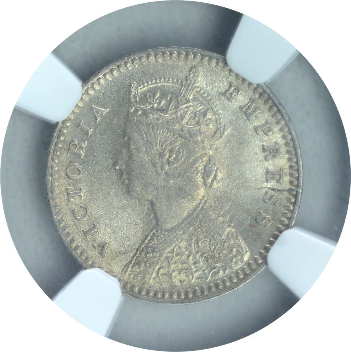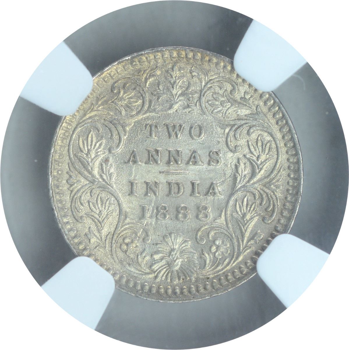 1888, Victoria Empress, Silver 2 Annas, Calcutta Mint, B/II/None, (PR # 503), graded slabbed by NGC as MS 62 (gem UNC), Rare.