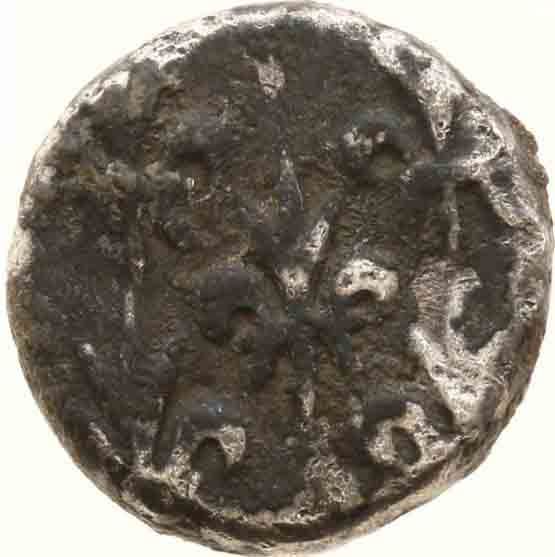 India-French, Pondicherry, 2 Fanon, Obv: ornamented crown, Rev: 5 fleur-de-lis, (KM# 49),3.02g,14.55mm,about very fine.