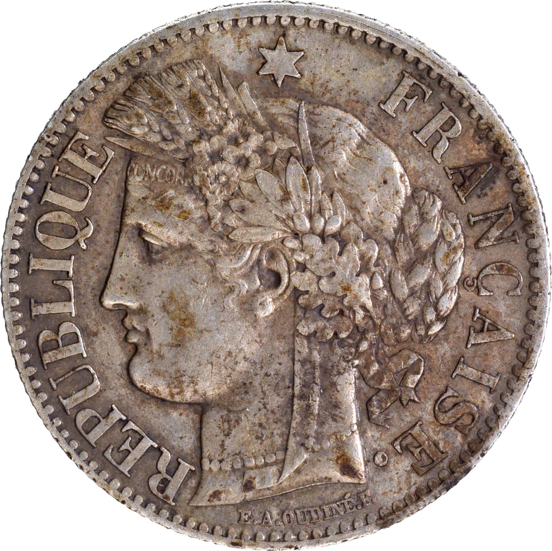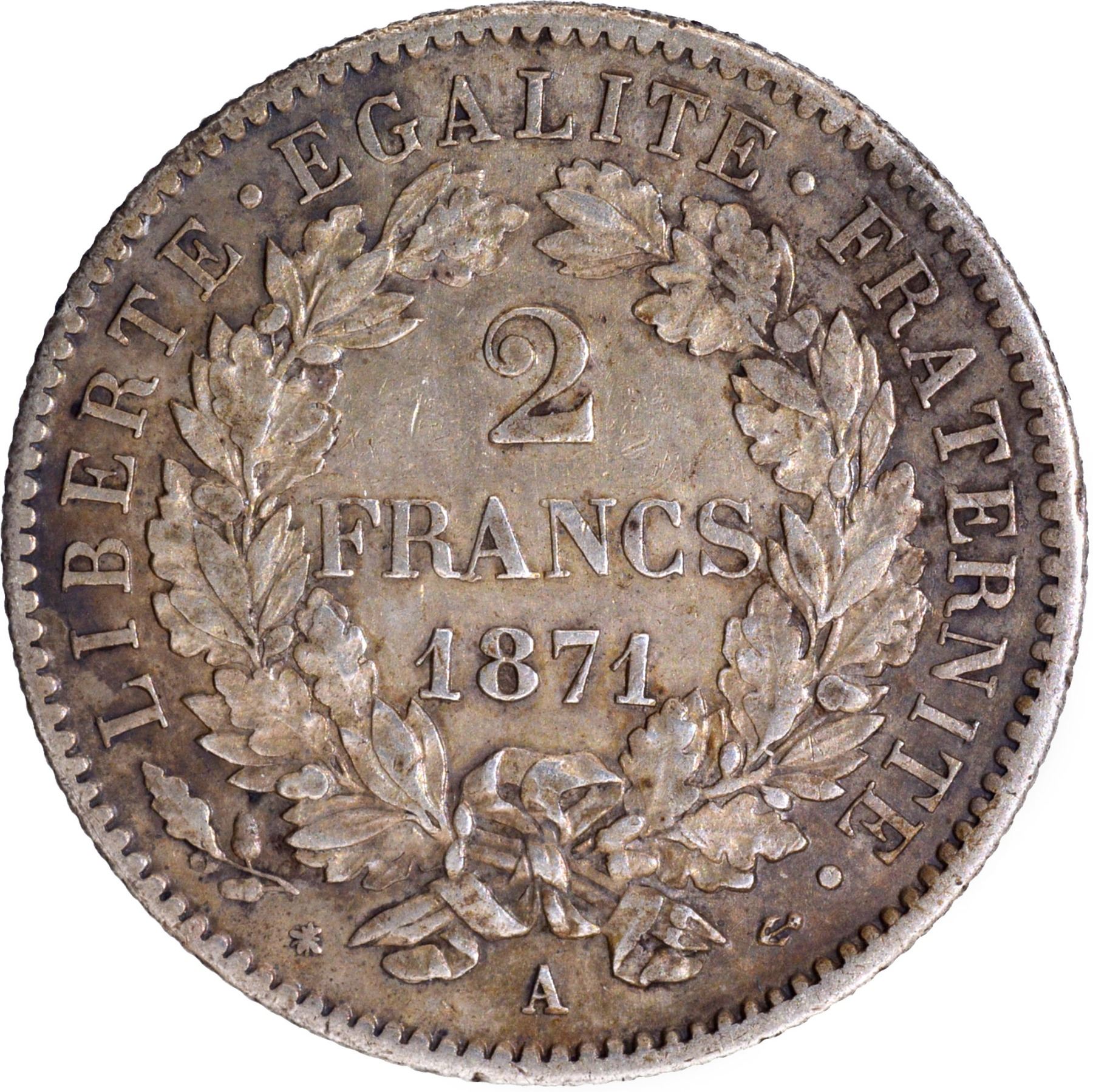 France,Third Republic, Silver 2 Francs, 1871 A, Paris Mint,Obv:laureate head of Liberty facing left,letteringREPUBLIQUE FRANCAISE around the field,Rev: value date withinwreath, the lettering LIBERTE.EGALITE. FRATERNITE around the field,mint mark A in the exergue,9.86g, 27.08mm,(KM# 817.1), about extremely fine, Rare.