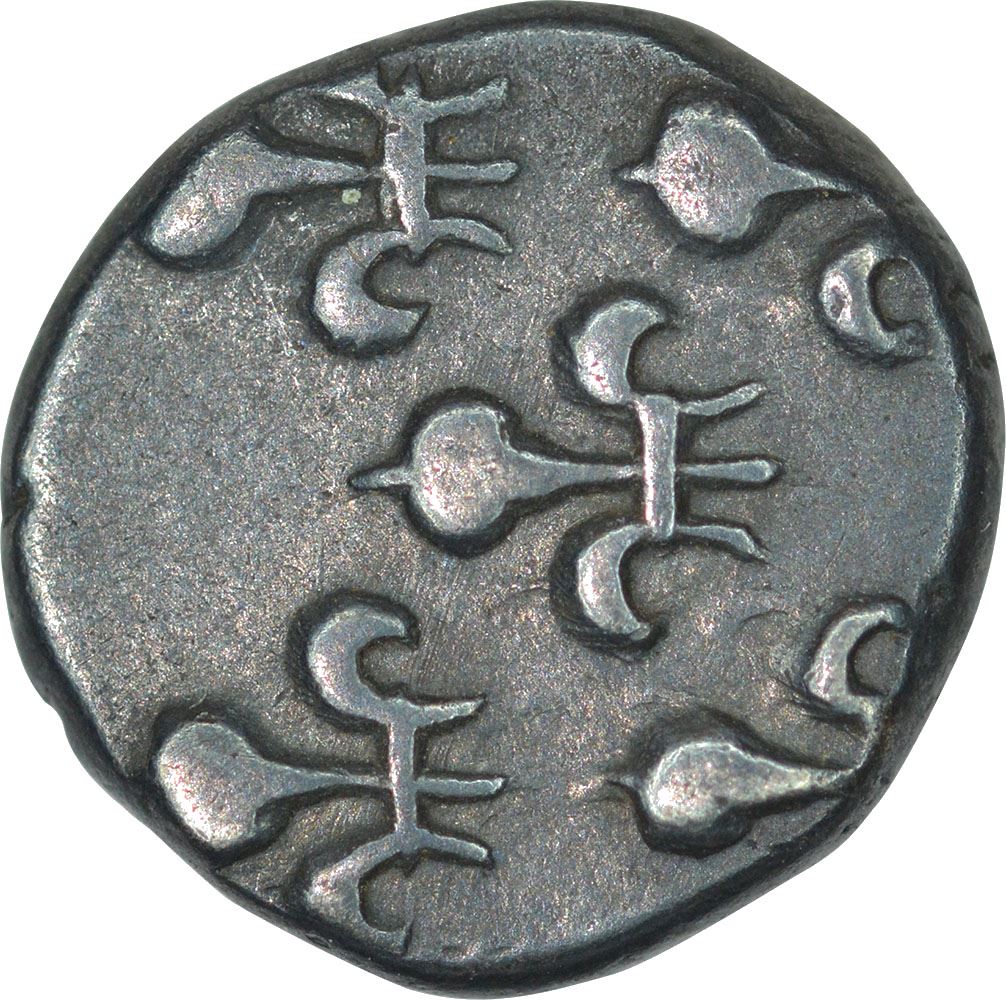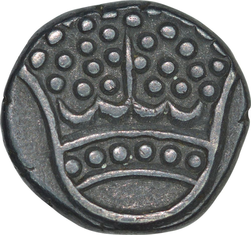 India-French, Pondichery Mint, Silver 2 Royaliners (1 Fanon), Obv: pearled crown, Rev: 5 fleur-de-lis, die rotated to 9'o clock, (KM# 44),1.5g, 11.37mm, tonedabout UNC, Extremely Rare in this condition.The series of these coins were struck from Pondichery mint, these condition coins are seldom offered where the crown is complete and also the fleur de lis are completely struck on the coins. This specimen is at par with the condition, strikes, impressions and has an additional die rotation variety.Usually sells for 350-400 Euros in overseas auctions.