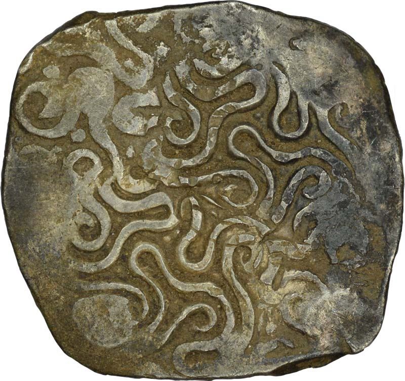 Panchala Janapada, Varanasi-Jaunpur Region, Silver Vimshatika, Broad Flan,Obv:geometrical symbol with depicts an octopus with spread tentacles above a cave, with three of its tentacles holding a horse, a snake and a bird, Rev: uniface,4.45g,24.44 x 26.02mm, aboutexcellent and deep hammered,Unpublished,ExtremelyRare.