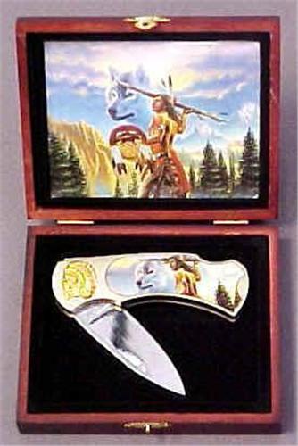 Handles: Solid Polished Matte Silver Tone with Full Color Inlaid Panel on both sides. Gold Indian Head on front side. Comes in a Wooden Display Case with a Molded Flocked Insert, and a Full Color photo Blade Length: 3-1/2" Blade Thickness: 1/16" and almost 1" wide Closed Length: 4-1/2" Blade Material: Stainless Steel