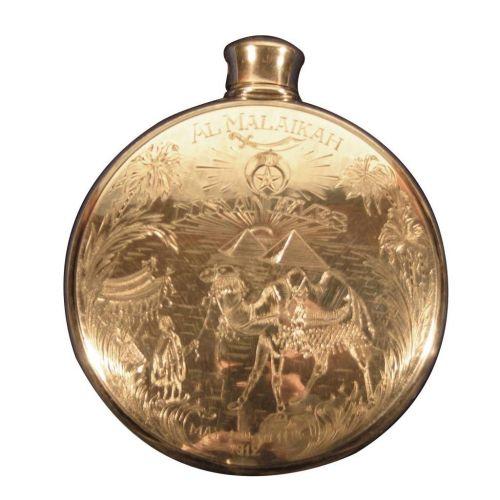 Silver Whiskey Flask engraved Al Malaikah, Los Angeles, CA., comes in original box. which states exclusively for Arab Patrols and Shrine Bands. Excellent condition. 4 inch diameter.