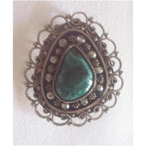 A very old wirework brooch that can be worn either as a pendant or a brooch - the back has a bale on it for suspending a chain for wear as a necklace. Very ornate wirework, fabulous workmanship with a triangular shaped green marbled moss agate stone at the centre. Measures 1-3/4" inches tall by 1-1/2" inches wide and in excellent vintage condition but there is some rubbing to the tiny pearl color beads that alternate with the wirework flowers around the moss agate stone, this is only noticeable under a jeweler's loupe. Marked silver 925 on the back.
