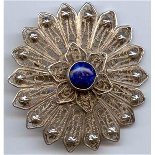 <table width="100%" border="0" cellspacing="0" cellpadding="4"><tr><td><em> </em></td></tr><tr> <td width="100%"> This lovely brooch measures 2" in diameter and is in excellent condition. At the center of the silver wirework is a lapis lazuli cabochon. Though not marked, I would assume the silver is 800, or European Silver. This could be Italian or Israel There is a simple c-clasp on the back. </td></tr><tr> <td> </td></tr><tr> <td>Reference #: fjstbro57</td></tr><tr><td>Condition:See Description</td></tr><tr><td>Year:1940-60s</td></tr><tr><td>Title:Silver Wirework Lapis Pinwheel-style Brooch</td></tr><tr><td>Location:Missoula Montana</td></tr></table>