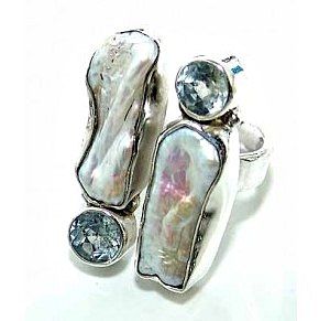 Silver and Biwa Pearl & Blue Topaz Ring. Allow 6 to 8 weeks for delivery.