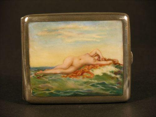 Silver and Enamel Cigarette Case, depicting a nude. Shows scratches throughout enamel good color and condition. 3 3/4 X 2 1/4 inches.