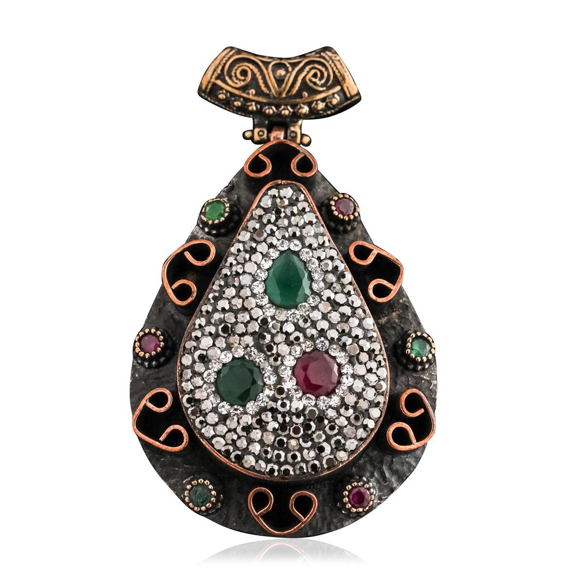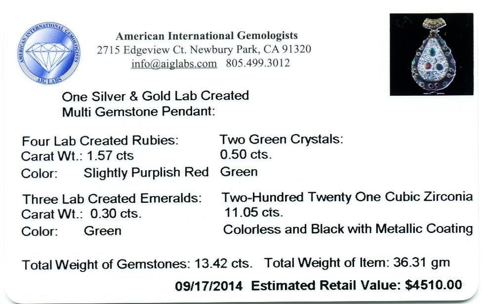 One electronically tested silver and gold lab created multi gemstone pendant. The pendant features two lab created green crystals and one lab created ruby set within an cubic zirconia encrusted pear shaped medallion, completed by a patterned bail. Bright and anodized finish. Identified with markings of "925". Condition is new, good workmanship. Containing: Two bezel set pear and round cut laboratory created green crystals approximate total weight of 0.50ct., clarity is slightly included, medium dark, very slightly grayish, green color, (GIA G 6/3), cut is good. Transmitting light with a minimum of distortion, transparent. Color grade is an average for the pair. Graded in the setting. Three bezel set round brilliant cut laboratory created emeralds, measuring 3.10 - 3.00 x 1.98 mm, approximate total weight of 0.30ct., clarity is eye clean, type III, medium dark, moderately strong, green color, (GIA G 6/4), cut is good. Transmitting light with no distortion, transparent. Color grade is an average for the group. Graded in the setting. One bezel set round brilliant cut laboratory created ruby, measuring 6.00 - 6.00 x 3.90 mm, approximate weight of 1.12ct., clarity is eye clean, type II, medium dark, very slightly brownish, slightly purplish red color, (GIA slpR 6/3), cut is good. Transmitting light with no distortion, transparent. Graded in the setting. Three bezel set round brilliant cut laboratory created rubies, measuring 3.10 - 3.00 x 1.98 mm, approximate total weight of 0.45ct., clarity is eye clean, type II, medium dark, very slightly brownish, slightly purplish red color, (GIA slpR 6/3), cut is good. Transmitting light with no distortion, transparent. Color grade is an average for the group. Graded in the setting. Two hundred twenty-one prong set round brilliant cut laboratory created cubic zirconias, measuring 1.90 - 1.80 x 1.20 mm, approximate total weight of 11.05ct., cut is good. Contains a mixture of colorless and coated metallic cubic zirconia. Graded in the setting. Total Weight of Colored Stones 13.42ct. Total Weight of Pendant 36.31gm. AIG Appraised at $4,510.00. AIG Appraised at $4,510.00.