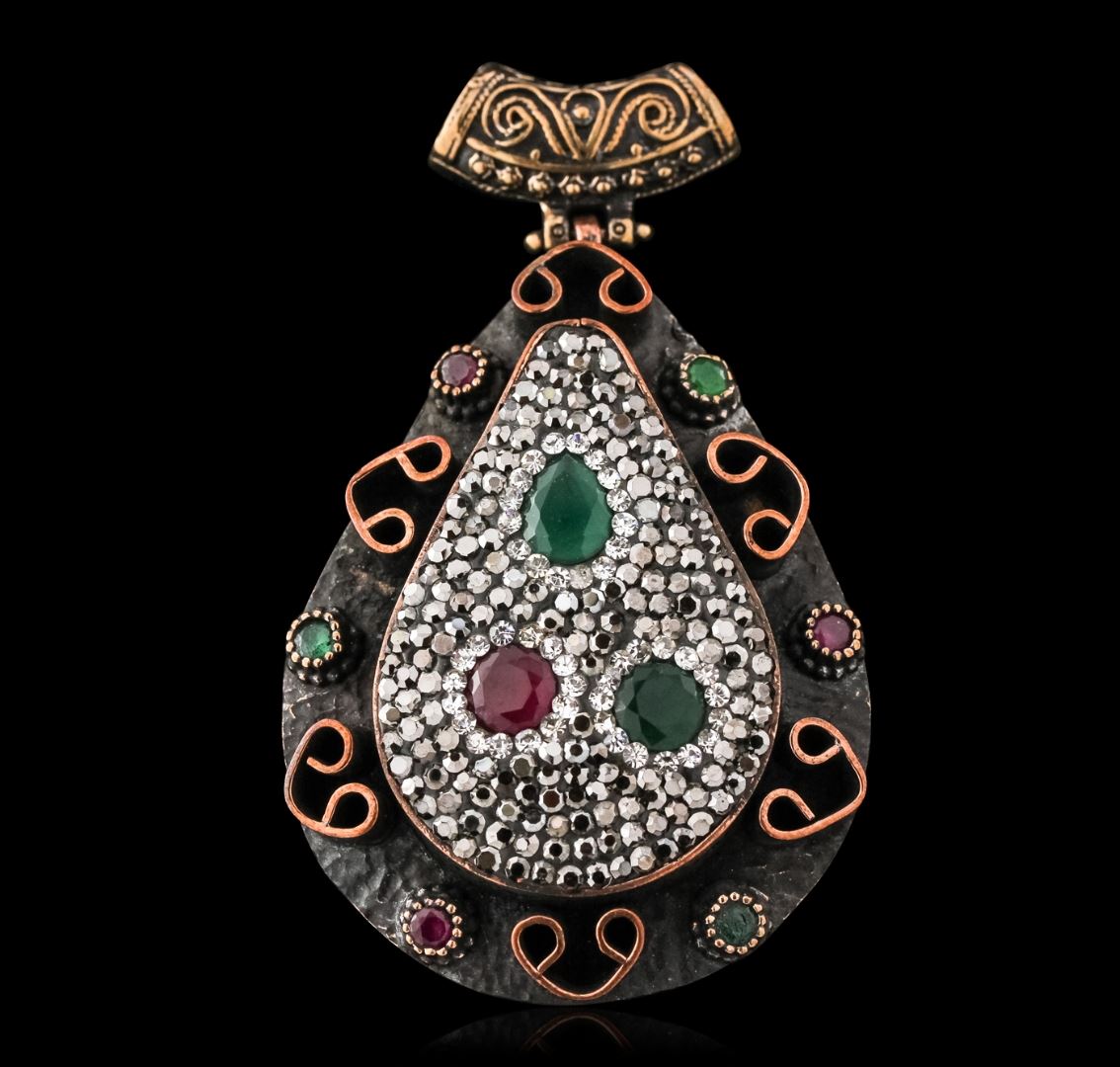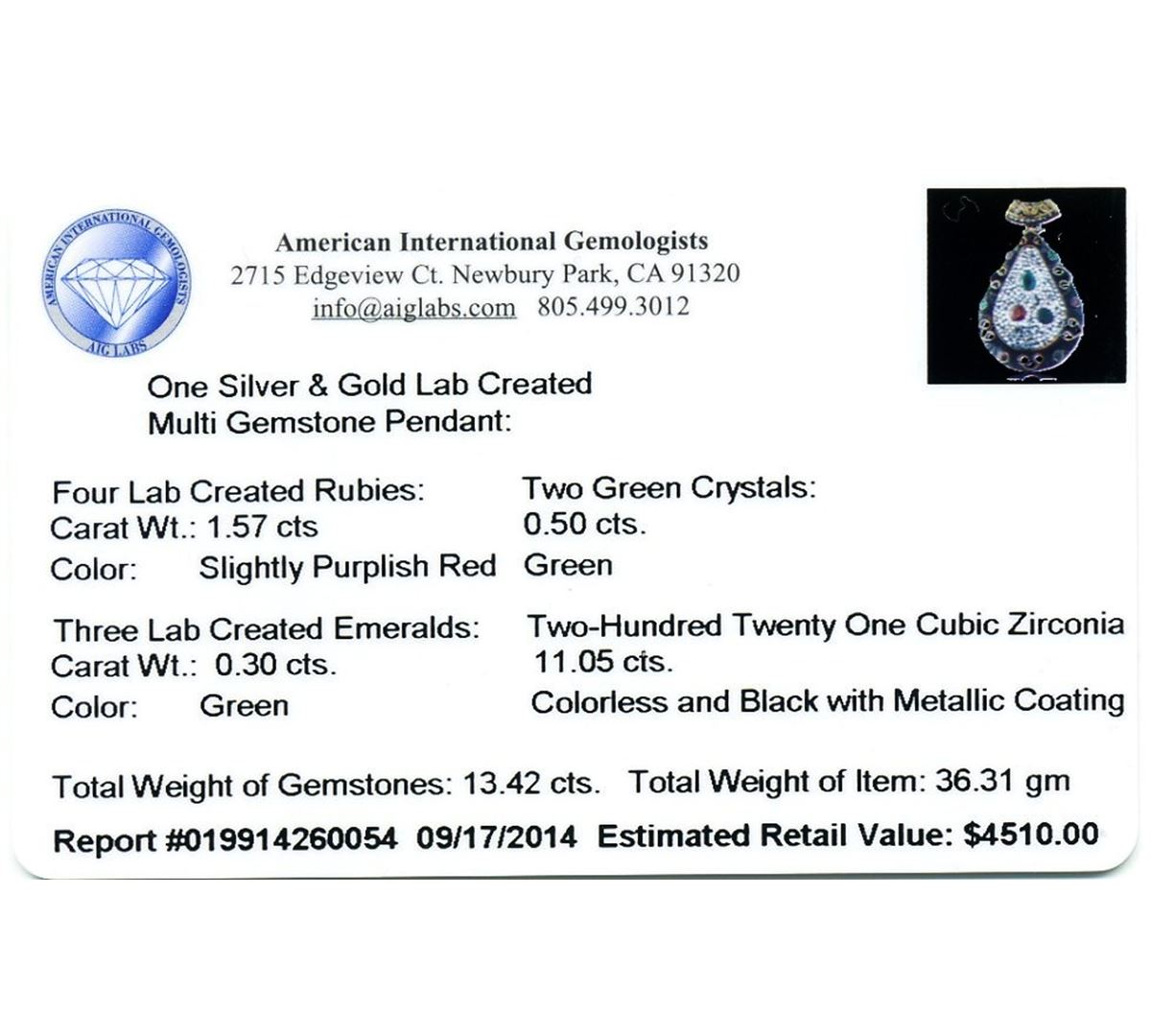 One electronically tested silver and gold lab created multi gemstone pendant. The pendant features two lab created green crystals and one lab created ruby set within an cubic zirconia encrusted pear shaped medallion, completed by a patterned bail. Bright and anodized finish. Identified with markings of "925". Condition is new, good workmanship. Containing: Two bezel set pear and round cut laboratory created green crystals approximate total weight of 0.50ct., clarity is slightly included, medium dark, very slightly grayish, green color, (GIA G 6/3), cut is good. Transmitting light with a minimum of distortion, transparent. Color grade is an average for the pair. Graded in the setting. Three bezel set round brilliant cut laboratory created emeralds, measuring 3.10 - 3.00 x 1.98 mm, approximate total weight of 0.30ct., clarity is eye clean, type III, medium dark, moderately strong, green color, (GIA G 6/4), cut is good. Transmitting light with no distortion, transparent. Color grade is an average for the group. Graded in the setting. One bezel set round brilliant cut laboratory created ruby, measuring 6.00 - 6.00 x 3.90 mm, approximate weight of 1.12ct., clarity is eye clean, type II, medium dark, very slightly brownish, slightly purplish red color, (GIA slpR 6/3), cut is good. Transmitting light with no distortion, transparent. Graded in the setting. Three bezel set round brilliant cut laboratory created rubies, measuring 3.10 - 3.00 x 1.98 mm, approximate total weight of 0.45ct., clarity is eye clean, type II, medium dark, very slightly brownish, slightly purplish red color, (GIA slpR 6/3), cut is good. Transmitting light with no distortion, transparent. Color grade is an average for the group. Graded in the setting. Two hundred twenty-one prong set round brilliant cut laboratory created cubic zirconias, measuring 1.90 - 1.80 x 1.20 mm, approximate total weight of 11.05ct., cut is good. Contains a mixture of colorless and coated metallic cubic zirconia. Graded in the setting. Total Weight of Colored Stones 13.42ct. Total Weight of Pendant 36.31gm. AIG Appraised at $4,510.00. AIG Appraised at $4,510.00.