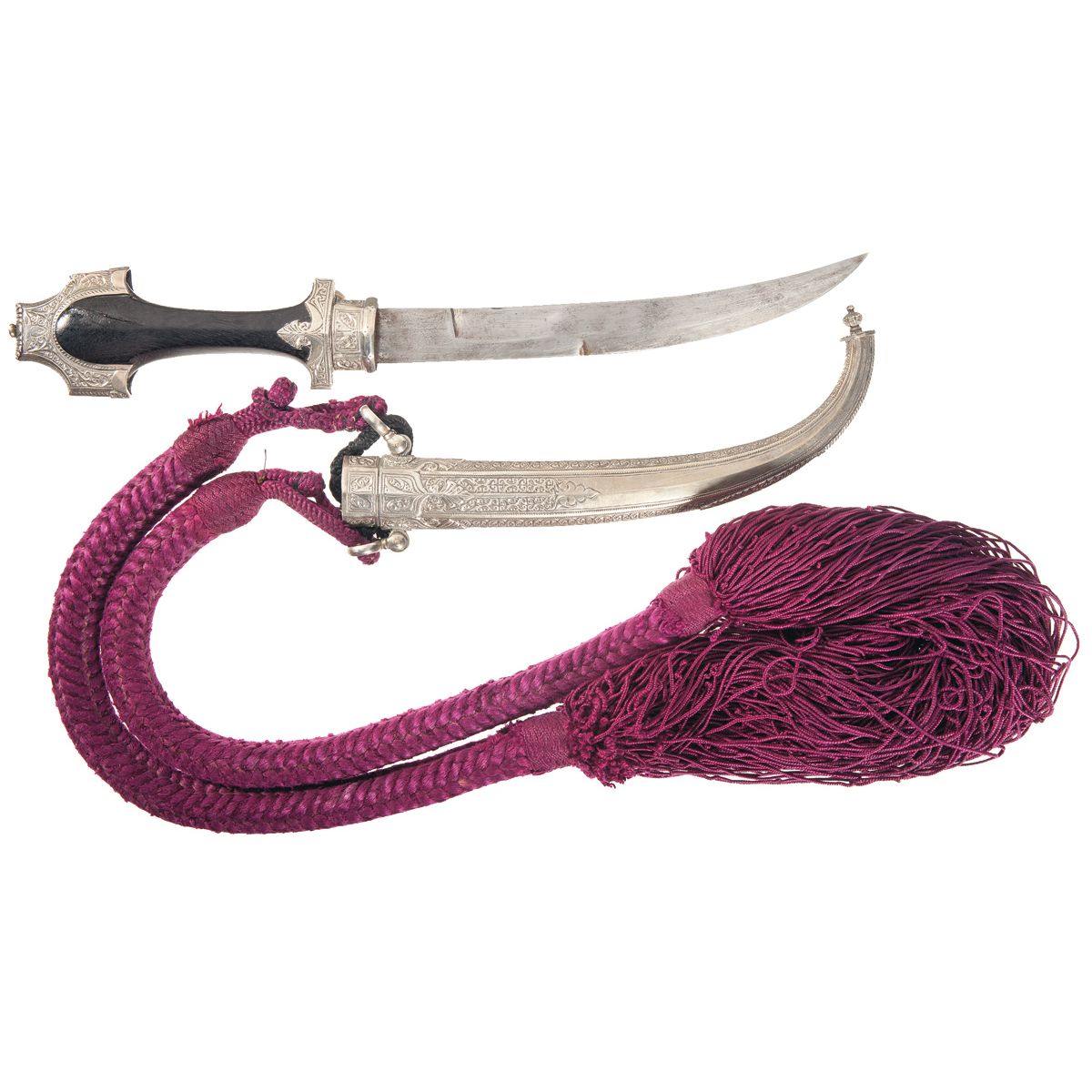9 1/2" curved double edge blade, with ebony grip. Guard, pommel and sheath are engraved silver with engraved gold floral accents. With a purple fabric shoulder hanger. Grip cracked, otherwise good.