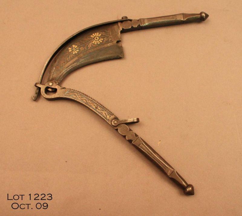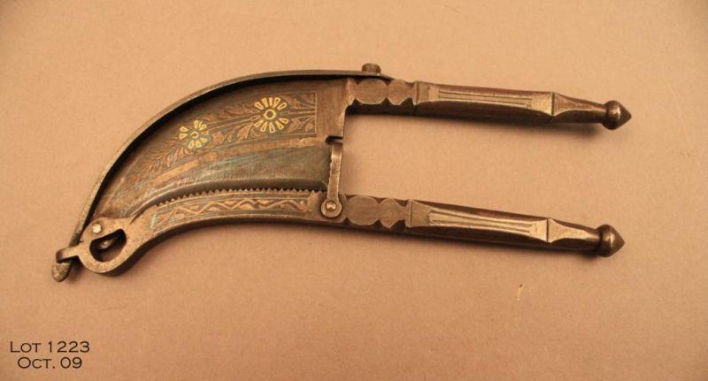 Silver and Niello on steel 19th century cutting tool. Hi quality good condition. Possibly a tobacco cutter. Est. $150 - $300