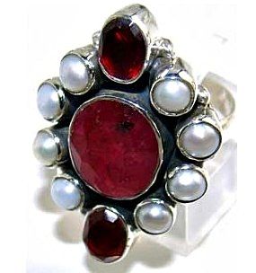 Silver and Ruby, Pearl & Garnet Ring. Allow 6 to 8 weeks for delivery.