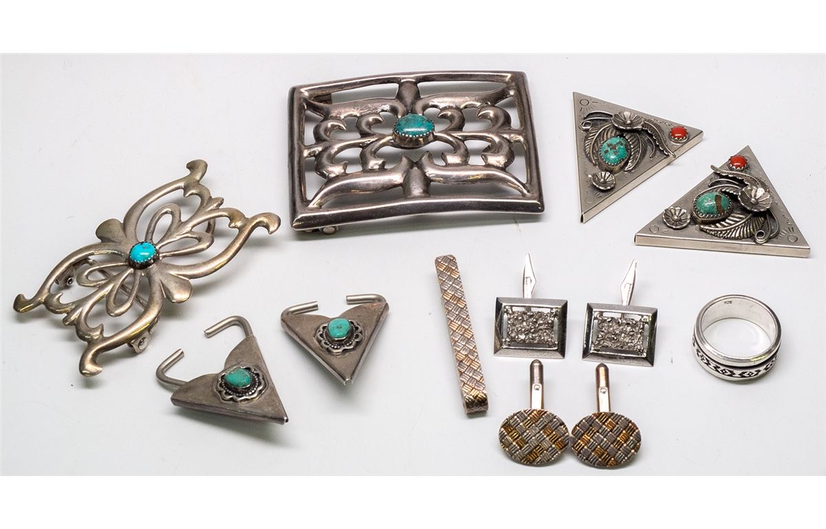 Lot of 11 various pieces of silver, gold and turquoise jewelry from the Southwest. Lot includes sterling silver oblong cufflinks, 14k gold and sterling silver oval cufflinks with tie clasp, two sterling belt buckles with oval turquoise enhancement, a men’s “spinner” ring and four sterling silver belt end cuffs with blue and red turquoise decorations. This is a varied lot with a common theme. Fairbanks Collection - HKA#65190
