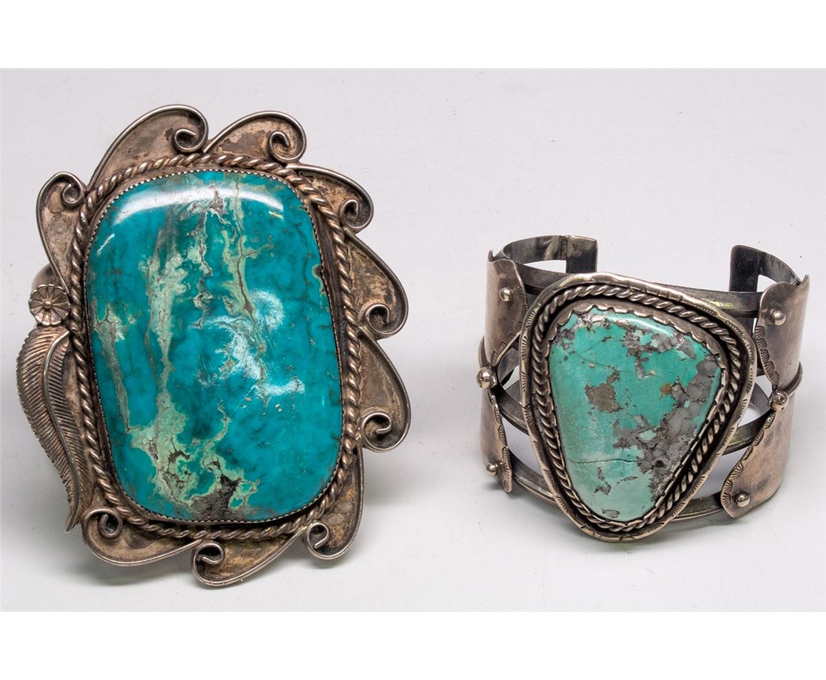 Lot of 2, probably Navajo made. 1) A cuff-style bracelet with openwork silver bands upon which is mounted a triangular piece of matrix turquoise with a rope-style band and a thin solid silver band around the bezel. On either side of the central stone 2 silver butterflies are attached, covering nearly the entire sides of the bracelet. Inked on the reverse is the name “Yellow Horse.” 2) Another cuff-style bracelet of openwork silver bands with a large (2 x3”) matrix turquoise cabochon mounted in an elaborate bezel of curled silver “waves” and feather, with rope edging. Maker’s mark of PF is stamped on the reverse. - HKA#65178