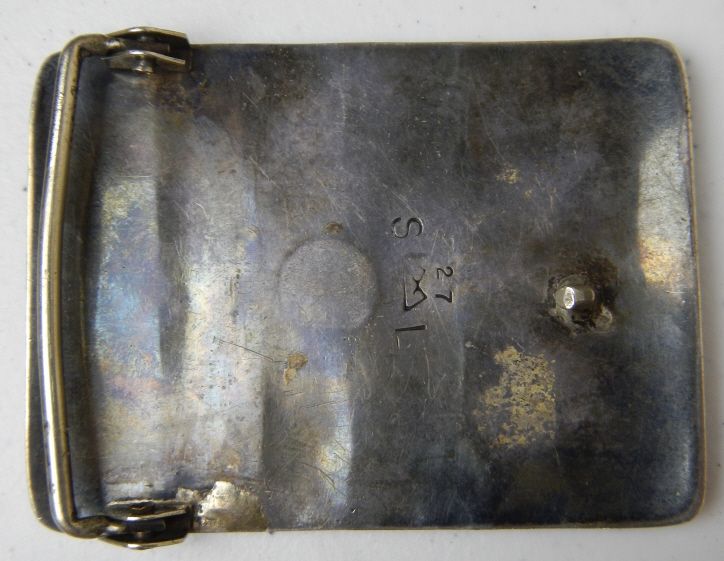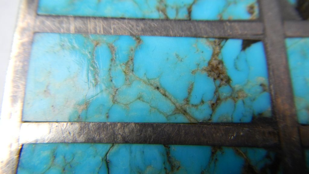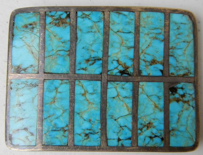 Silver and Turquoise Navajo Belt Buckle - This is piece is made by the Navajo Native Americans and is entirely Silver. The bottom reads, "27 S (with a figure) L." This measures 3" across.