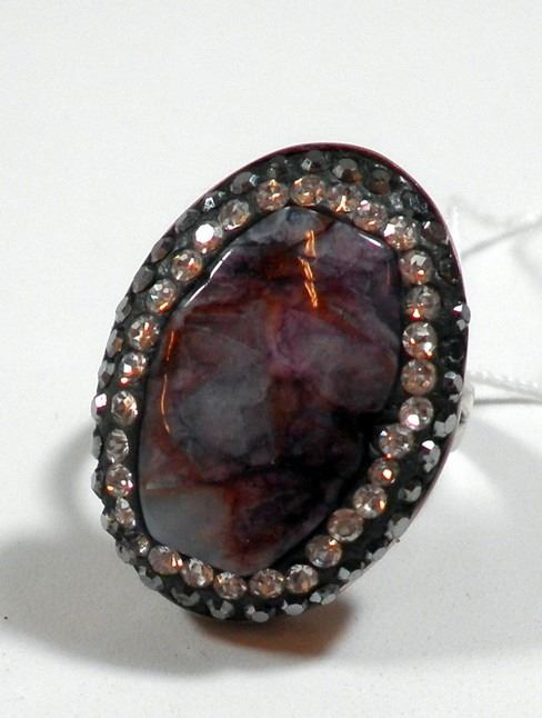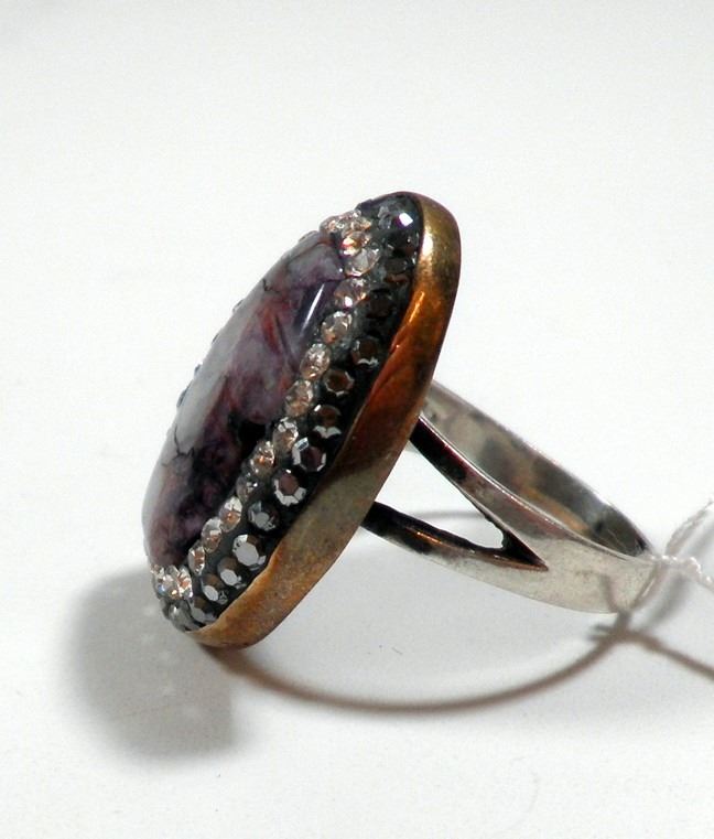 Silver and brass ring set with central oval marble gemstone surrounded by transparent gemstones, size 7, weight: 13 gm.