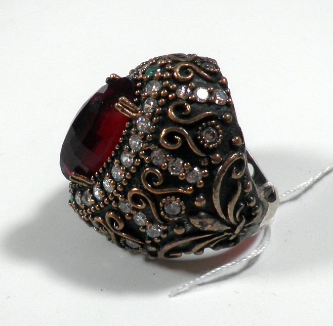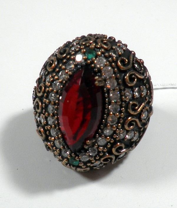 Silver and brass ring set with central red gemstone, surrounded by transparent gemstones and 2 green stones, size 11, weight: 26.3 gm.