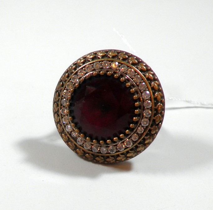 Silver and brass ring set with central red gemstone, surrounded by transparent gemstones, size 7, weight: 13 gm.