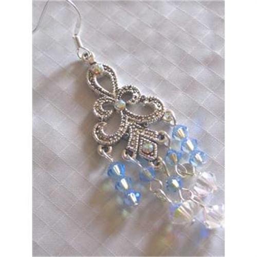 All Swarovski components make up this beautiful pair of chandelier earrings! Beautiful marcasite look. I used 4mm sapphire ab color crystals and 6mm clear crystal ab bi-cones. <p>A must see! Shimmery sparkle, stylish and glamorous. these measure 2 3/4 in. silver plate french hook ear wires