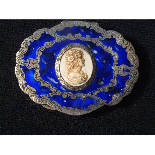 19th.-20th. century European silver box with chased gilded silver on cobalt enamel. A central cameo carving represents a noble woman, decorates the obverse side. The interior is gilded and marked with 800 and a mark that could not be identified. The reverse side is chased in bas relief. Size: 3.2" X 2.6" (8 X 6.5 cm.).