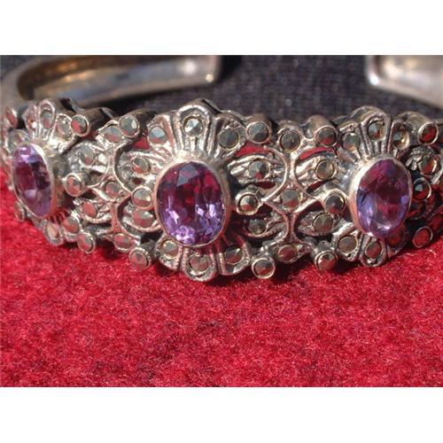 Silver bracelet decorated with 3 amethyst stones and marcasite. It is in perfect condition without any damages. Estimated retail value: $1000.