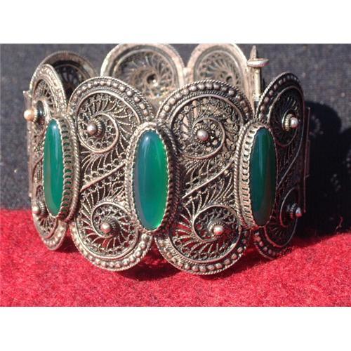 Silver bracelet decorated with 6 oval shape translucent emerald green chalcedony stone decorations. The bracelet is hand made with intricate filigree silver. It is in perfect condition without any damages. Diameter: 2.3" (6 cm.) Estimated retail value: $1000