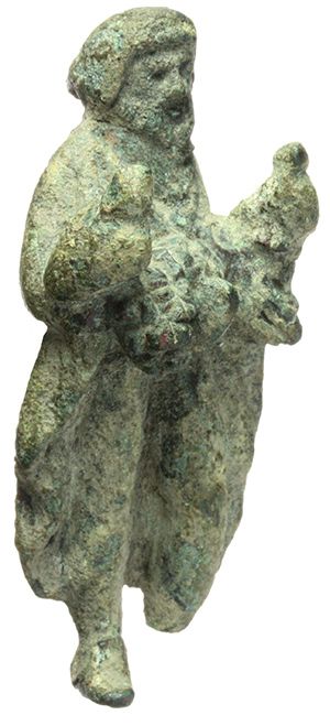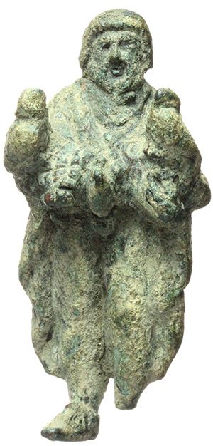 Silver, bronze and iron. Bronze Ithyphallic Priapus. Roman, Balkan region, circa 2nd-3rd century AD. D/ The god depicted standing facing, bearded, nude but for a mantle draped on his back and loaded with fruits supported by his erect phallus forward. In the hands he holds two birds. 6 cm high.