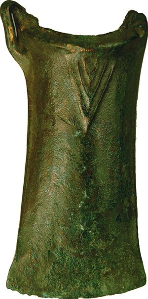 Silver, bronze and iron. Bronze socketed axe-head. Bronze age, Balkan region. D/ With three triangular ribs near the edge. 8.5 cm length.