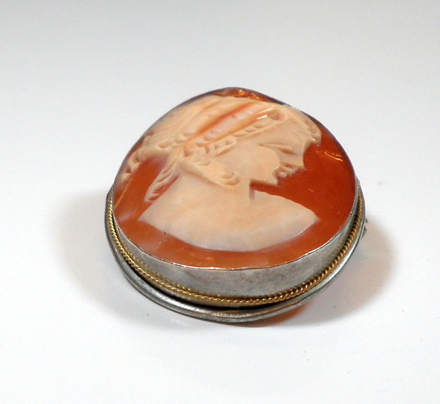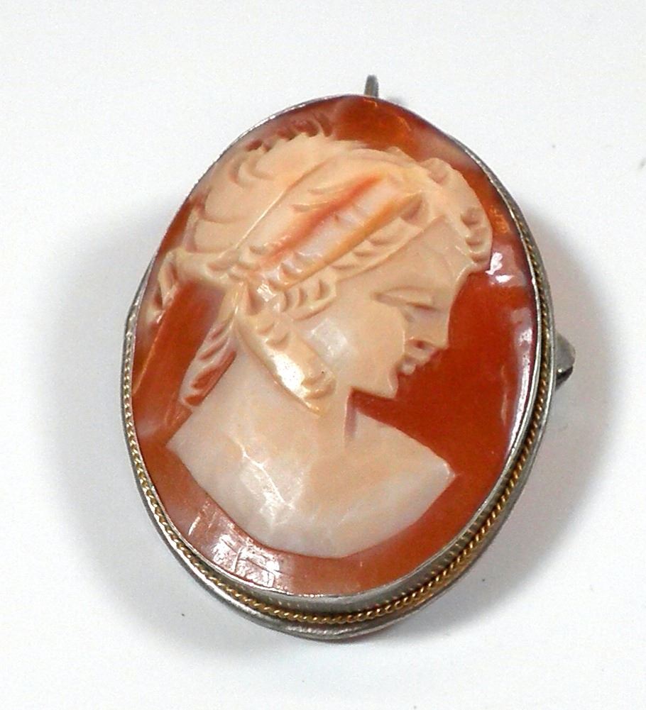 Silver brooch-pendant with cameo setting, crack in left side of cameo, weight: 5.1 gm, dimensions: 2.5x3.5 cm.