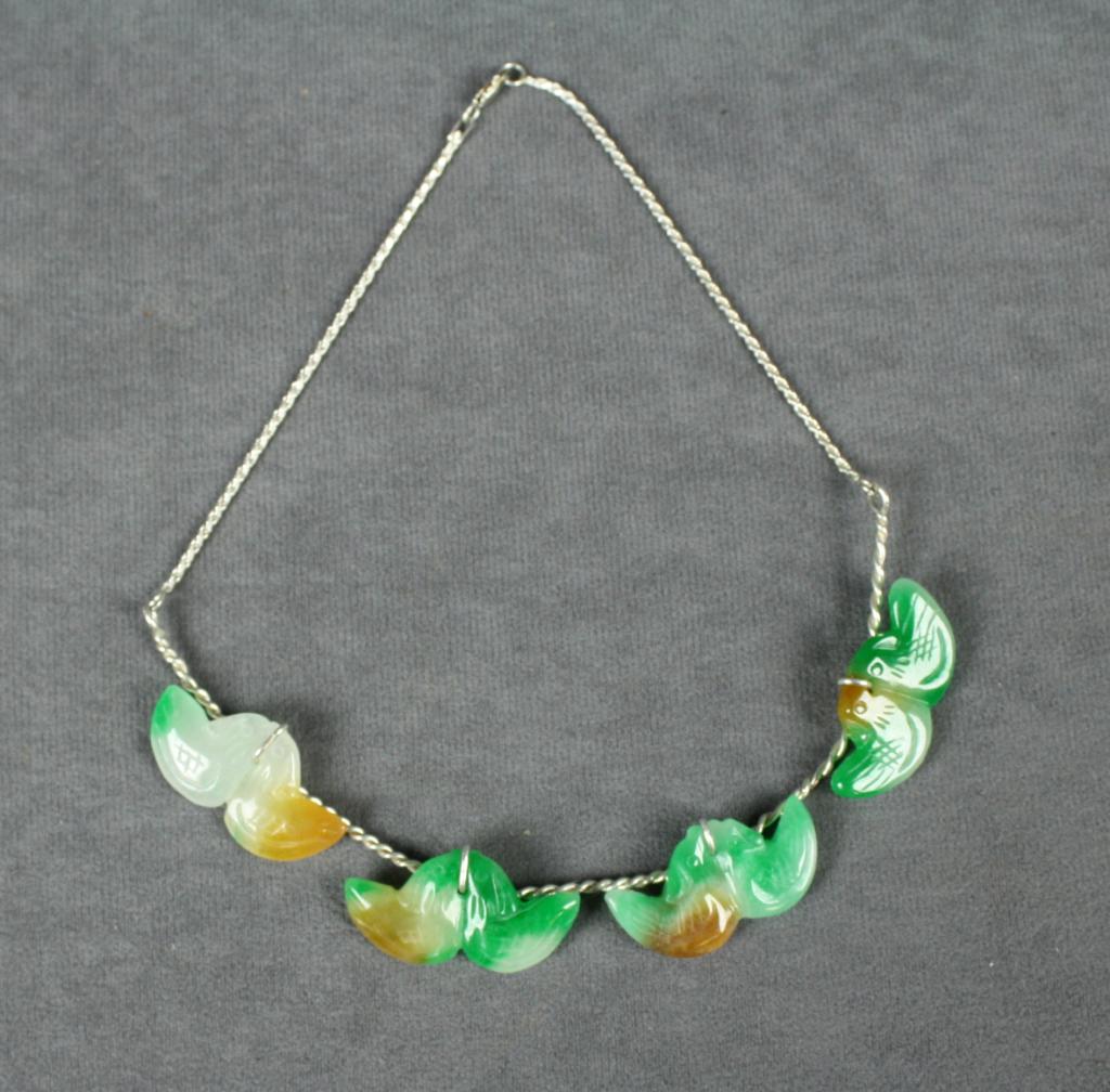 Silver chain necklace set with four pairs of carved multicolor jade birds. Est. $300-$600.