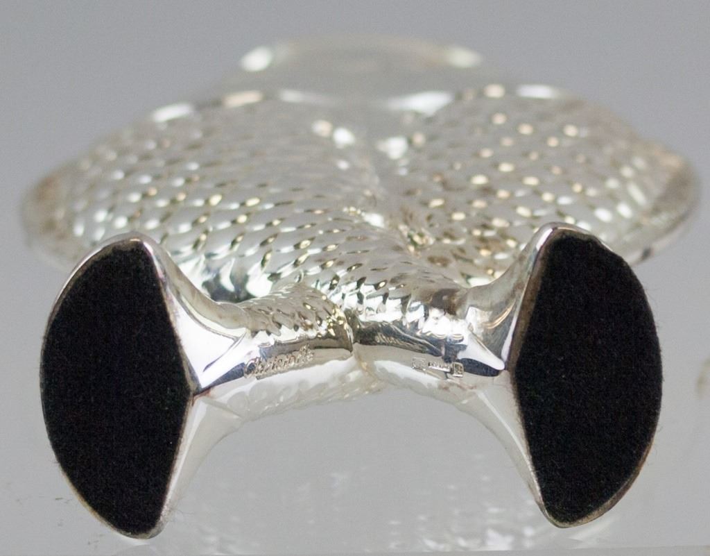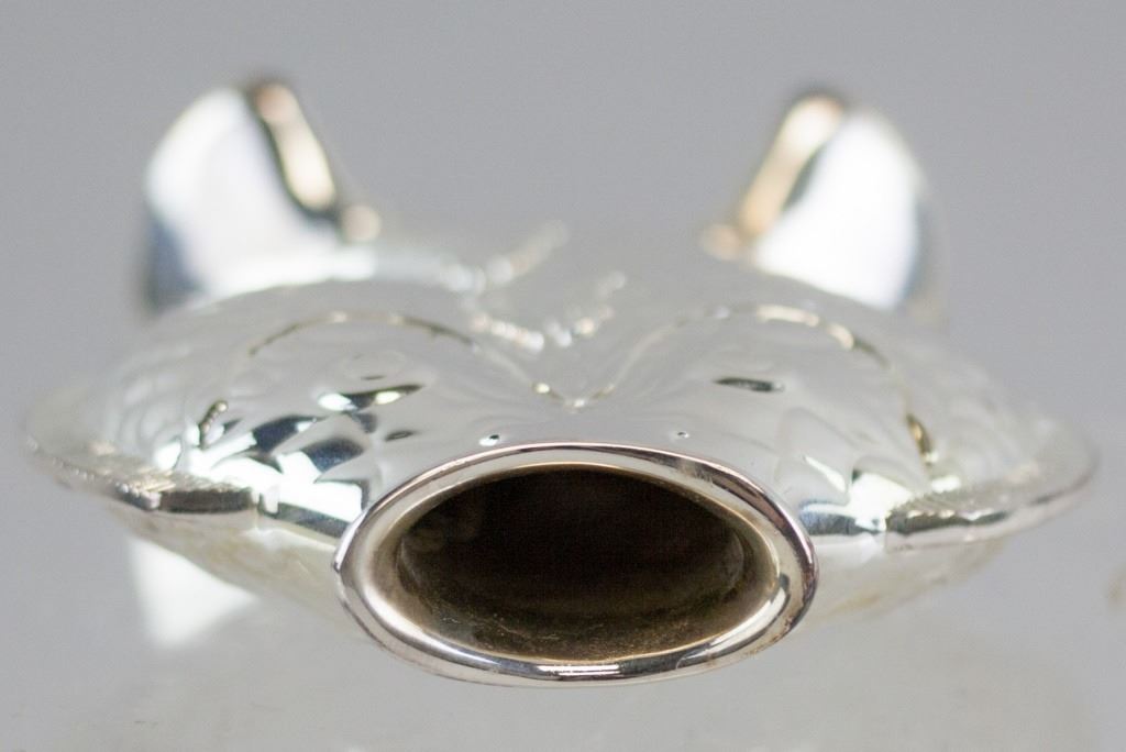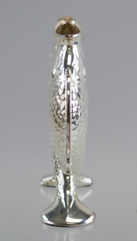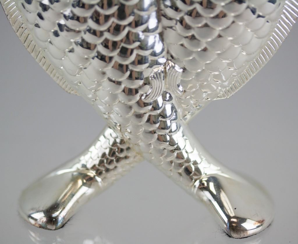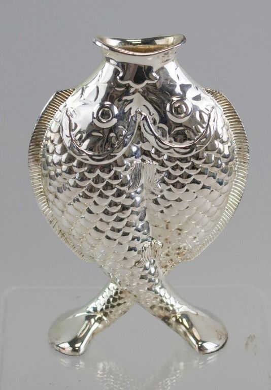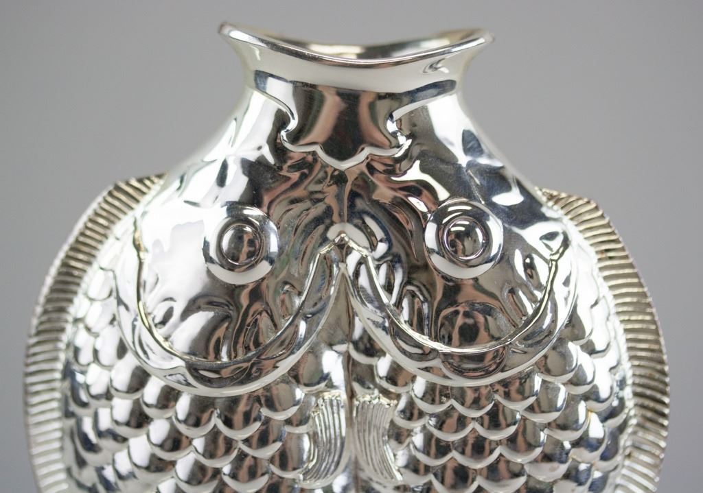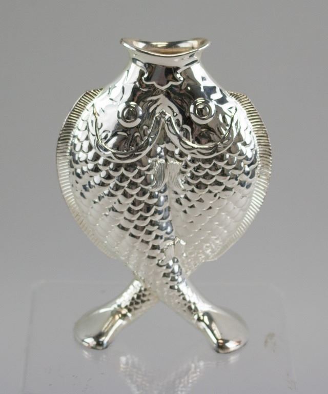Silver-colored fish vase. Of double-fish design. Vase: 14.5 x 10 cm, 976 grams. Box: 15 x 21.5 x 5 cm, 1144 grams total.