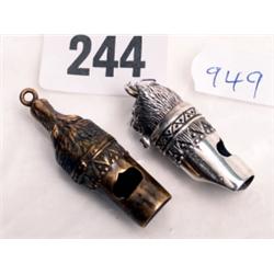 Silver decorative whistle with cat's head mount, plus another with dog's head mount