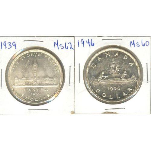 Silver dollar 1939 in MS-62 and 1946 in MS-60. Lot of 2 coins.