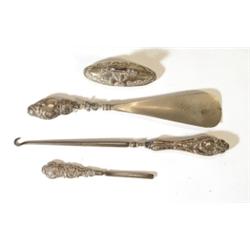 Silver handled button hook, tweezers, nail buff and shoe horn