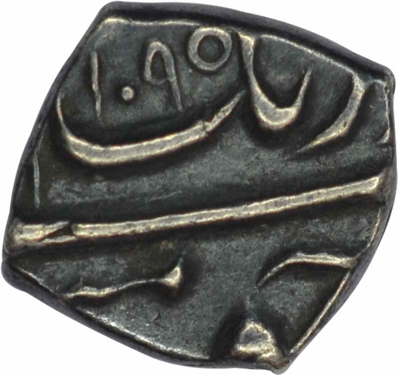Burhanpur (out of flan), Silver 1/8 Rupee,AH 1095, Obv: "badr munir" couplet, Rev: sana julus zarb, 1.45g, 10.13 x 9.83mm, about extremely fine, full date is rare.