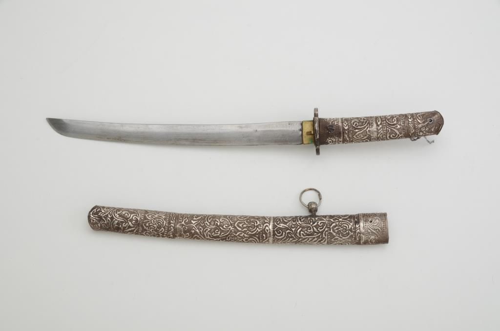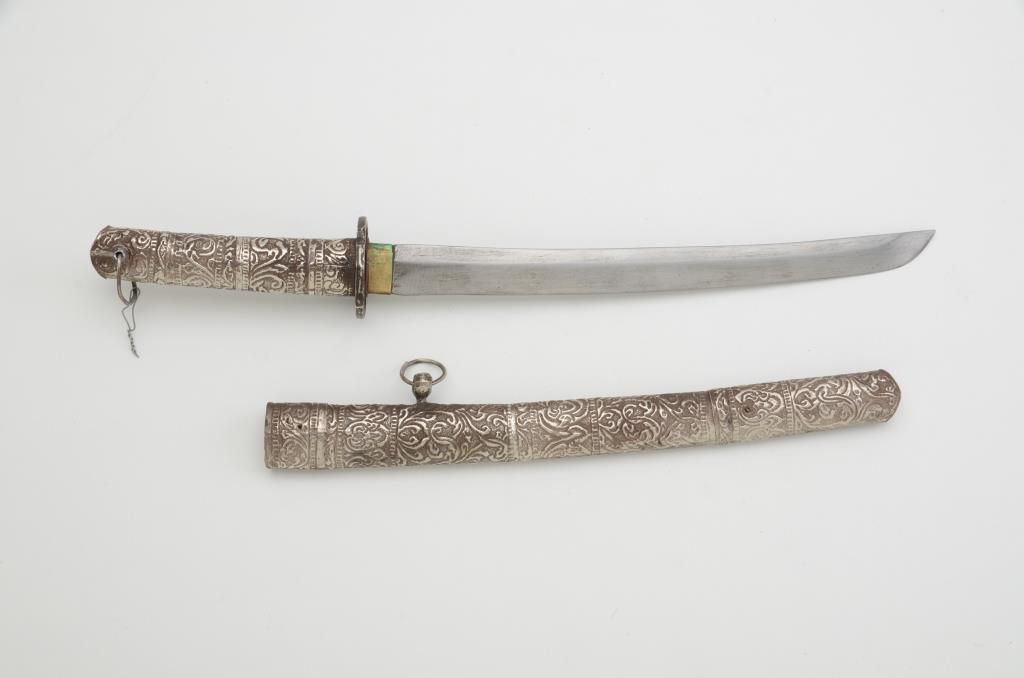 Silver overlaid short sword, approx. 18” overall with a 12” blade; Japanese or Chinese, shows age. Est.: $150-$300.