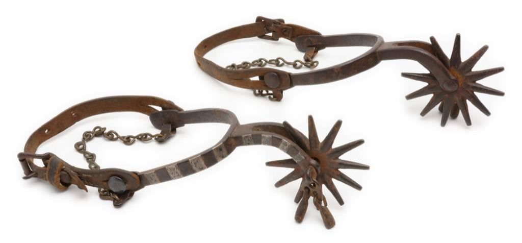 Silver overlay spurs with large 3-3/4” 12 point rowels and jingle bobs with simple leather straps. No visible maker marks. Est.: $300-$600.