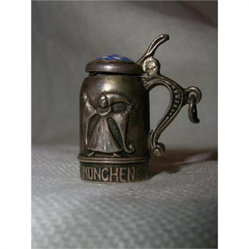 Vintage silver pendant in the shape of a beer stein, marked München, with blue and white enamelled cover.