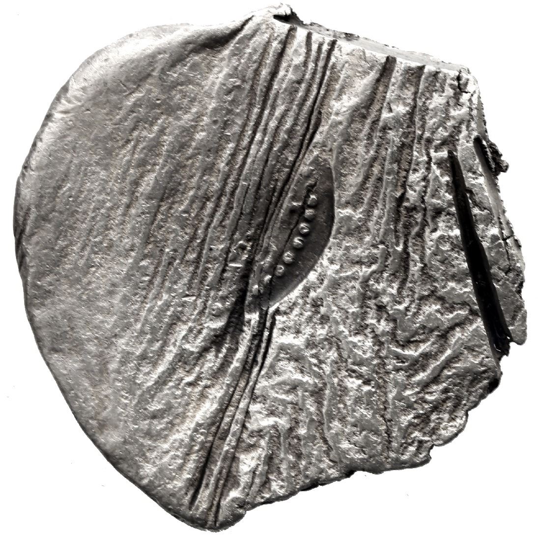Silver "plata corriente" disk with tax stamp, 49.45 grams. 1-3/4" in diameter, 1/4" thick. Very attractive example in a round, coin-like form of fairly even thickness, only about half the edge broken or cut from a large "splash" ingot, its top somewhat smooth (just some neat metal-flow lines) and graced with a prominent partial circular tax stamp (just the outer border of dots), probably for Philip II (late 1500s).